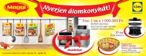 Vásároljon bármilyen két darab Maggi termékeket a Lidl-ben,hogy megnyerhesse az 1 millió Ft értékű konyhai háztartási gépet vagy a 30 db ételpároló egyikét, továbbá az első 300 beküldő garantált ajándékként egy 3000 Ft értékű Maggi csomagot kap.