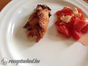 Hozzávalók: 0,5 kg filézett pulykamell 3 nagyobb érett paradicsom 2 fej fokhagyma kevés fokhagymakrém rozmaring 1 nagyobb mozzarella kakukkfű borecet, vagy balzsamecet só fekete bors (őrölt) 1 pohár natúr joghurt Elkészítése: Először a salátát készítjük el, mert miután a hűtőben kissé összeért, az kerül a húsba is. A paradicsomot és a mozzarellát kockára vágjuk, egy […]