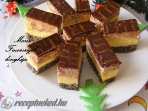 Hozzávalók: 5 tojás fehérje 15 dkg cukor 15 dkg darált mák 2 kanál liszt fél csomag sütőpor Krém készítése 5 tojás sárgája 10 dkg cukor 1 kis doboz mascarpone 15 dkg margarin 1 csomag vaníliás pudingpor 3 dl tej Tejszínes krém 2 dl tejszín 5 dkg olvasztott csokoládé 2 kanál porcukor Tetejére 10 dkg ét csokoládé 5 dkg vaj […]