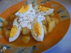 Hozzávalók: 6-7 db krumpli 15 dkg kolbász 3 szelet füstölt tarja(szeletelt), vagy bacon 1 db közepes hagyma kevés olaj só, bors, vegeta, pirospaprika, petrezselyem 4 db tojás 1 kis doboz tejföl Elkészítése: Felteszünk egy tálba vizet forrni a tojásokkal. Egy másik edénybe a hagymát apróra kockázzuk, kevés olajon megpirítjuk, majd a felkarikázott kolbászokat is hozzárakjuk, és a […]