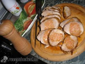 Hozzávalók: 30 dkg tisztított sertésháló 45 dkg szűzpecsenye 38 dkg sertés kolbászhús sertéshús fűszersó Elkészítése: A darált húst kolbászhús módjára elkészítjük, és a megtisztított szűzeket felszúrjuk (2 darabot). A nyílásba töltjük a darált húst. Lehet kolbásztöltővel is dolgozni, de kézzel is megoldható ekkora mennyiségnél. A sertéshálót elvágjuk ketté, és beleburkoljuk a sertés fűszersóval bekent pecsenyénket. […]