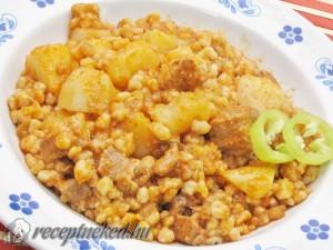Hozzávalók: 1/2 kg sertéslapocka 40 dkg házi tarhonya 10 dkg húsos szalonna fél szál házikolbász 4 krumpli 1 nagy fej hagyma 3 gerezd fokhagyma 1 paprika 1 paradicsom 1 tk őrölt pirospaprika kevés őrölt kömény só frissen őrölt bors 1 kk zsír ízlés szerint csípős paprika 1 kis pohár fehérbor Elkészítése: A húst megmossuk, felkockázzuk. […]
