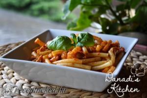 Hozzávalók: 1 egész csirkemell 1 kis üveg piros pesto 2 szál újhagyma kevés kacsazsír 1 csomag makaróni tészta bazsalikom só bors oregánó Elkészítése: A csirkemellet csíkokra vágjuk, a hagymákat karikázzuk. Magas falú serpenyőben a kacsazsíron megdinszteljük a hagymát, majd hozzáadjuk a csíkozott húst is. Fehéredésig pirítjuk, majd fűszerezzük. Kisebb lángon folytatjuk a sütést. Nagyjából 10 […]