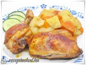 Hozzávalók: 8 csirkecomb A páchoz: só, őrölt bors 1 kanál ketchup 2 kanál étolaj 1 teáskanál őrölt pirospaprika Köret: 3 kg krumpli 5 sárgarépa 3 petrezselyem gyökér 8 gerezd fokhagyma 1 nagy fej hagyma Elkészítése: A csirkecombokat az ízeknél kettévágjuk, majd az összekevert páccal bekenjük. A zöldségeket megtisztítjuk, a krumplit feldaraboljuk, a répát és a […]