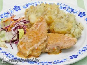 Hozzávalók: 6 szelet malackaraj 2 dl száraz fehérbor 5 dkg vaj 1 vöröshagyma 5 gerezd fokhagyma 1 kk őrölt pirospaprika só frissen őrölt bors kevés szárított kakukkfű és csilipehely 1 ek liszt 1 ek tejföl kevés olaj a sütéshez Elkészítése: A vékonyra szelt hússzeleteket lisztbe forgatjuk, kevés olajon mindkét oldalán elősütjük. A húsokat kivesszük, majd […]