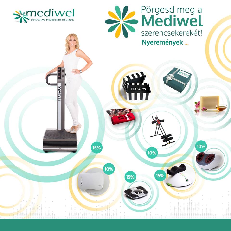 Ha Ön egészségtudatos, odafigyel az étkezésére és fontosnak tartja a rendszeres sportot, ajánljuk figyelmébe legújabb, Facebook-ra tervezett Applikációnkat! A játékban ugyanis olyan hasznos nyereményekkel lehet gazdagabb, melyek nemcsak értékesek, de az egészsége megóvásában is segíthetik.Egész februárban forog tehát a Mediwel szerencsekereke a Facebook oldalon. Hogy a csábítóan értékes ajándékok közül a miénk lehessen egy, nincs más dolgunk, mint szerencsés kézzel megpörgetni a kereket úgy, hogy az a nekünk leginkább tetsző ajándéknál álljon meg. Ha nem sikerült elsőre kipörgetnünk a vágyott nyereményt, ajánljuk barátainknak a játékot a közösségi oldalon és máris újra tekerhetünk, plusz pörgetéssel jutalmazzuk azokat is, akik kedvelik az oldalt. A játékban résztvevők között pedig a promóció végén egy OTO Chili kockahas gépet és egy OTO e-Shape alakformáló, helyi zsírbontásra alkalmas készüléket is kisorsolunk! Megháromszorozhatjuk esélyeinket a Mediwel facebook oldalának kedvelésével és barátaink meghívásával, hiszen így nemcsak plusz pörgetésekre tehetünk szert, hanem a fődíj sorsolásba is háromszor kerülhetünk bele.