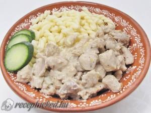 Hozzávalók: 80 dkg pulyka felső comb 1 nagy vöröshagyma 3 gerezd fokhagyma 200 g főzőtejszín 100 g reszelt sajt 100 g hámozott paradicsom konzerv (vagy 2 paradicsom meghámozva) kevés majoránna 1 dl száraz fehérbor só őrölt bors kevés olívaolaj Elkészítése: A pulykahúst apró kockákra vágjuk. A hagymát, a szétnyomott fokhagymát megdinszteljük. A pulykahúst hozzátéve fehéredésig […]