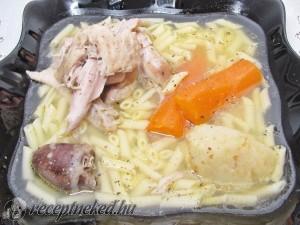 Hozzávalók: 500 g pulyka leveshús (far – hát, szárny, szív, zúza) 5 sárgarépa 2 petrezselyemgyökér 1 kisebb zeller 1 kisebb karalábé 1 nagyobb krumpli 1 vöröshagyma 2-3 gerezd fokhagyma kevés só néhány szem bors kis csokor petrezselyem- és zellerzöld 2 marék levestészta Elkészítése: A sárgarépát és a petrezselyemgyökeret megtisztítjuk, hasábokra vágjuk. A zellert és a […]