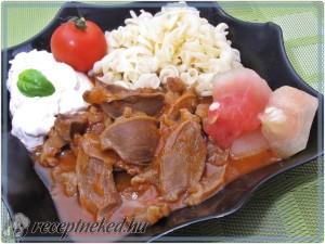 Hozzávalók: 1,5 kg pulykazúza 2 vöröshagyma 3 gerezd fokhagyma 2 zöldpaprika 1 nagyobb paradicsom kevés só frissen őrölt bors kevés csilipehely 1 kk őrölt pirospaprika kevés étolaj tejföl a tálaláshoz Elkészítése: A hagymát apróra vágjuk, kevés zsiradékon megdinszteljük, megsózzuk. A megmosott, átvizsgált, feldarabolt zúzát hozzátéve fehéredésig pirítjuk. Belerakjuk a felaprított paprikát és az apróra vágott […]