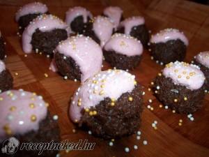 Hozzávalók: Alap: 500 g darált keksz 1 csomag puncsos pudingpor 5 dl tej 3 tk kakaópor 1 dl málnaszörp rumaroma 150-200 g cukor (ízlés szerint) 70 g darált dió Máz: 1 tojás fehérje 20 dkg porcukor pár csepp rumaroma pár csepp piros ételfesték Díszítés: dekorcukor, tortadara Elkészítése: A pudingot megfőzzük a szokásos módon, majd pici […]