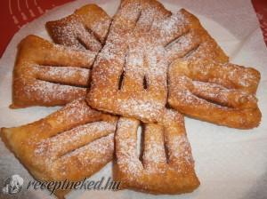 Hozzávalók: 2 dkg élesztő 1 kanál cukor 1 csipet só fél kg liszt 1 tojás 1 bögre tej étolaj a sütéshez porcukor Elkészítése: Az élesztőt a langyos tejben és a cukorral felfuttatom. Majd a többi hozzávalót is beleteszem, jól eldolgozom és kelesztőtálban kb. 30 percig kelesztem. Kinyújtom és derelyevágóval kockákat vágok és két hosszanti csíkot […]