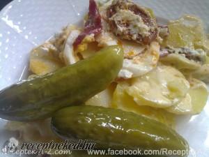 Hozzávalók: 1 kg krumpli 8 tojás 3 kolbász 250 ml tejföl 360 ml tejszín só őrölt bors olaj (vagy zsír) Elkészítése: A krumplit sós vízben megfőzzük, meghámozzuk és melegen felszeleteljük. A tojásokat keményre főzzük és karikákra vágjuk. A kolbászokat felszeleteljük. Egy mélyebb tepsi alját kikenünk olajjal (vagy zsírral) és a krumpli 1/3-ával kirakjuk. Megsózzuk, meghintjük […]