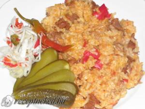 Hozzávalók: 60 dkg sertés lapocka 1 vöröshagyma 3 ek sertés zsír 1 ek pirospaprika 1 kk őrölt bors 2 kápia paprika 2 paradicsom 2 kk só 1 bögre rizs Elkészítése: Az elkészítéshez ezúttal kuktát használunk. A húst kockára vágjuk. A zsíron megdinszteljük az apróra vágott vöröshagymát és az egyik paprikát. A hagymát megszórjuk pirospaprikával, borssal, […]