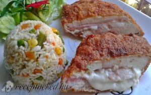 Hozzávalók: 2 egész csirkemellfilé 4 szelet trappista sajt 4 szelet bacon 4 szelet sonka só A panírozáshoz: 20 dkg finomliszt 3 tojás 30 dkg zsemlemorzsa A sütéshez: étolaj Elkészítése: A csirkemelleket ketté vágjuk, szétnyitjuk, kiklopfoljuk, sózzuk. Mindegyik csirkemellre teszünk 1-1 szelet sonkát, sajtot és bacont. A csirkemelleket összehajtjuk, lisztbe, tojásba, zsemlemorzsába forgatjuk, és bő olajban […]