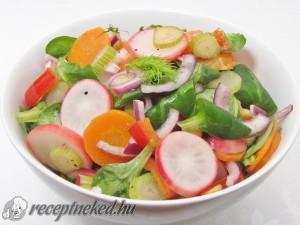 Hozzávalók: 1/2 édeskömény (ánizskapor) 2 sárgarépa 1/2 cs. retek 1 kis fej lila hagyma 1/2 kaliforniai paprika 2 marék madársaláta 1 ek extra szűz olívaolaj 1 tk fehérborecet Elkészítése: Az édesköményt és a többi hozzávalót feldaraboltam, felszeleteltem. A lila hagyma és a madársaláta kivételével mindent blansíroztam (rövid fürdő forró vízben). A forró vízbe kevés sót, […]