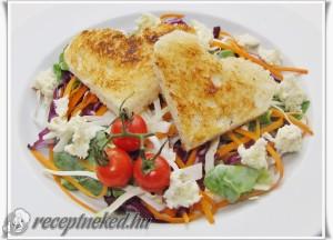 Hozzávalók: Fehér- és lila káposzta sárgarépa tépett zöldsaláta mozzarella olíva olaj kevés balzsamecet csipet só kenyérszeletek pirítósnak Elkészítése: A fehér- és lila káposztát, a sárgarépát vékony csíkokra vágjuk, a tépett zöldsalátát és a feldarabolt mozzarellát hozzáadjuk. Az öntethez némi olíva olajat balzsamecettel, csipetnyi sóval elkeverünk, és ezzel öntjük le a salátát, amit alaposan összeforgatunk. Serpenyőben […]