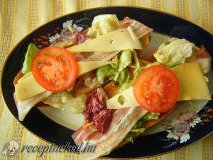 Hozzávalók: 180g salátakeverék 6 ek extra szűz olíva olaj 5 dkg vöröshagyma 0,5 dl sör 2 ek almaecet 1 kk mutár csipet só frissen őrölt bors 4 db hosszú zsömle 8 szelet füstölt bacon 1 db paradicsom 5 dkg Maasdamer sajt Elkészítése: A paradicsomot megmossuk, kivágjuk a szárhoz kapcsolódó zöld részt, végül 8 szeletet vágunk […]