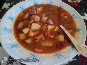 Hozzávalók: 2-3 szál fehér és sárgarépa 1-1 TV, kápia, erős paprika 1 nagyobb paradicsom 2 nagyobb fej vöröshagyma 3-4 gerezd fokhagyma 15-15 dkg húsos és zsírszalonna 2-3 evőkanál sertészsír 1,5 kg sertés lapocka 1,5 kg krumpli só, bors, paprika ízlés szerint gulyásleves kocka, piros arany, gulyáskrém Elkészítése: A répákat karikázzuk, a hagymákat, paprikát, paradicsomot és […]