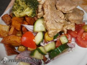 Hozzávalók: 60 dkg karaj 1 brokkoli 1 kígyóuborka olívabogyó 2 lila hagyma 3 paradicsom 1 kg sárga burgonya sertéssült fűszerkeverék étolaj Elkészítése: A húst kisebb szeletekre vágjuk, megszórjuk a fűszerekkel, és serpenyőben kevés olajon fehéredésig sütjük mindkét oldalát. A zöldséget összevágjuk, hozzákeverjük az olívabogyót. A brokkolit rózsáira szedve sós vízben puhára főzzük. A brokkoli gyorsan […]