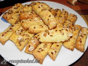 Hozzávalók: 50 dkg rétesliszt 50 dkg tehén túró 20 dkg sertészsír 2 tojás 3 tk só 2 kávéskanál szódabikarbóna magok tetszés szerint (szezám-, len-, napraforgó-, köménymag, rozs-, búzapehely, mák, stb.) Elkészítése: Elkeverem a lisztet a sóval és a szódabikarbónával, majd összegyúrom a túróval, a zsírral, és az egyik tojással. Pár órát hűtőben pihentetem, majd lisztezett […]