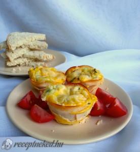 Hozzávalók: 5 tojás 1 tk mustár só bors 10 dkg sonka apró kockára vágva 10 dkg reszelt sajt (camembert használtam) 5 dkg reszelt sajt a tetejére (füstölt sajt) 16-18 szelet sonka friss metélőhagyma vagy lilahagyma ízlés szerint Elkészítése: Habverővel elkeverjük a tojást, sót, borsot, hagymát, mustárt, majd belekeverjük a 10 dkg reszelt sajtot és az […]