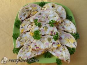 Hozzávalók: 20 dkg csirkemell sonka (18 szelet) 10 tojás 10 dkg párizsi 3 közepes csemegeuborka 1 közepes vöröshagyma 1 közepes lila hagyma 1 ek mustár 2 dl tejföl 25 g zselatin 1 dl víz 2 ek napraforgó olaj só ízlés szerint bors ízlés szerint Elkészítése: 9 tojást megfőzünk, megtisztítjuk, és felkockázzuk. Az őzgerincformát sonkaszeletekkel kibéleljük. […]