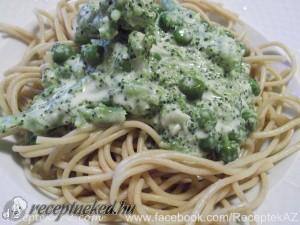 Hozzávalók: 300 g spagetti 100 g sajt (tömlős) 200 ml főzőtejszín 500 g brokkoli 1 csésze zöldborsó só őrölt feketebors 3 gerezd fokhagyma Elkészítése: A spagettit és a brokkolit külön-külön megfőzzük, és leszűrjük. A wokban felmelegítjük a tömlős sajtot, hozzáadjuk a tejszínt. Ízesítjük sóval, őrölt fekete borssal és zúzott fokhagymával. Kevés ideig forraljuk, majd hozzáadjuk […]