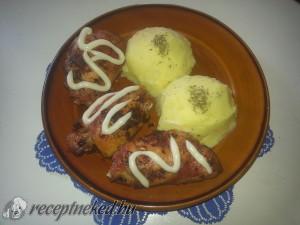Hozzávalók: 2 kg csirke felső comb tört fokhagyma ételízesítő bors só kömény fűszerkeverék oregánó majoránna 1 pörköltszaft ízesítő kocka Köret: 2 kg krumpli 12,5 dkg margarin/vaj 2,5 dl tej Elkészítése: Hús: Bő zsírral kikenjük a tepsit. A húst rárakjuk. A tört fokhagymát kevés vízben pihentetjük, majd megkenjük vele a húst (fokhagyma darabok is rámehetnek)! Tetszőleges […]