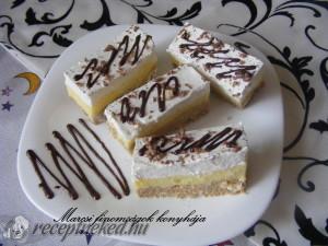 Hozzávalók: 50 dkg darált keksz 50 dkg gesztenyemassza 1-2 ek tej (ha szükséges) rum (ízlés szerint) Krém hozzávalói: 2 csomag vaníliás pudingpor 6 dl tej 15 dkg margarin 10 dkg porcukor Tetejére: 4 dl habtejszín 5 dkg porcukor 1 csomag habfixáló gesztenye, csokiforgács Elkészítése: A darált kekszet a gesztenyemasszával, és ízlés szerinti rummal összegyúrom. Egy […]