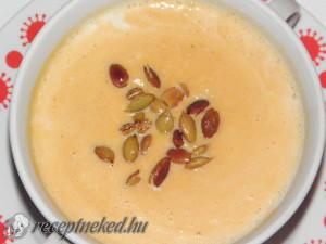 Hozzávalók: 50 dkg sütőtök 5 dkg vaj 1 fej vöröshagyma 1 csipet fehérbors 1 csipet szerecsendió 1 dl főzőtejszín 1 l húsleves alaplé, vagy víz 1 marék natúr tökmag 1 ek étolaj ízlés szerint só Elkészítése: A sütőtököt feldarabolom és megsütöm. A hagymát felkockázom és a vajon megdinsztelem. Hozzáadom a fűszereket és a felaprított sült tököt, […]