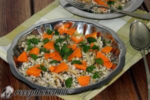 Hozzávalók: 20 dkg árpagyöngy (gersli) 30 dkg sütőtök (vékonyra felvágva) 1 narancs héja és leve 1 ek fehérborecet 3 ek mogyoróolaj (vagy olívaolaj) 1 db vöröshagyma (vagy lila hagyma) 1 kis csokor menta 1 kis csokor petrezselyemzöld csipet só ízlés szerint cukor (vagy édesítőszer) Elkészítése: Az árpagyöngyöt enyhén sós vízben főzzük éppen csak puhára, majd szűrjük, és […]