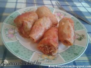 Hozzávalók: 1 közepes fej édes káposzta 50 dkg rizs 80 dkg darál sertéshús 2 közepes vöröshagyma 2 gerezd fokhagyma paradicsompüré v. házi paradicsomlé só bors pirospaprika Elkészítése: Először vizet teszünk fel forrni a káposzta “fonnyasztásához”. A káposztát megmossuk, és kivágjuk a torzsáját. Mikor forr a víz, beletesszük egészben a káposztát, és néhány percig hagyjuk főni. […]