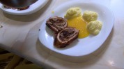Tejszínes, tárkonyos pulykaragu leves, Gesztenyével és vörösborban érlelt aszalt szilvával töltött pulykamell-tekercs, baconbundában krumplipüré-rózsával és narancsmártással, mogyorókrémmel töltött Karácsonyi torta
