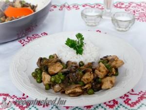 Hozzávalók: 50 dkg csirkemell 50 dkg gomba 1 cs újhagyma 25 dkg zöldborsó 2 gerezd fokhagyma 3 ek szójaszósz 3 ek citromlé 3 ek olívaolaj 2 chili paprika (vagy paprikakrém) 1 tk barna cukor 1 tk kukoricaliszt só Elkészítése: A csirkemellet vágjuk fel kisebb kockákra. A gombát ízlés szerint szeleteljük fel. Az újhagymát vágjuk fel […]