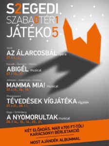 A kedvezményes bérletek tartalmazzák az összes jövő nyári produkciót, műfajok széles skáláján válogathatunk az izgalmas, szórakoztató előadások között. A tavalyi év kihagyhatatlan sikere, melyet már huszonnyolcezer néző látott Szegeden, a Mamma Mia! például megnézhető Shakespeare kacagtató szituációkkal teli színművével, a Tévedések vígjátékával vagy a jövő évad nagy durranásának ígérkező A nyomorultakkal és a Szabó Magda örökérvényű regényéből készült édes-bús musicallel, az Abigéllel is. Verdi egyik legnépszerűbb operája, a tiltott szerelemmel és gyilkos merénylettel fűszerezett Az álarcosbál A nyomorultakkal is kapható egy bérletben, de ha valakinek a Tévedések vígjátéka és A nyomorultak párosítás tetszik jobban, azt is megveheti.
