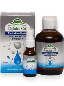 Hogyan hat az ezüstkolloid? Az ezüstkolloid közel 650 organizmust képes elpusztítani a szervezetben. Hatásos lehet még csontregenerálásra és gyorsabb csontgyógyulást eredményezhet, továbbá az ezüstkolloid felgyorsíthatja a bőr és más finom szövetek újraképződését. Az ezüstkolloid hatásos lehet az összes testfelszínen lévő, illetőleg a test belsejében megbúvó fertőzéses betegségek, gyulladások esetén. Az ezüstkollid a máj anatómiai szerkezetét is helyreállíthatja, illetve a májműködést erősítheti, így a szervezet méregtelenítését fokozhatja. Az ezüstkollid belsőleg a következő betegségek esetén alkalmazható: candida, allergia, szénanáthánál, nátha, megfázás, influenza, tüdőgyulladás, staphylococcusos és streptococcusos fertőzések, légzőszervi és orrüregi fertőzések, Lyme-kór, tüdőgyulladás, ízületi panaszok, reuma, agyhártyagyulladás, leukémia, szifilisz, AIDS, HPV-vírus, herpesz. Az ezüstkolloid külsőleg a következő betegségek esetén alkalmazható: aknés, pattanásos bőr, ótvar, skarlát, gombás fertőzések, bőrrák, kötőhártya gyull, fülgyull, szájnyálkahártya fertőzés, sebek, sérülések, horzsolások, herpesz, HPV-vírus, égés, napégés, fagyás, szemölcs, ekcéma, csípések, kiütések, bőrgombásodás, korpásodás. Az ezüstkolloid egyéb felhasználási területei: az ezüstkolloid szájon át közvetlenül, gargalizálásra, torokgyullnál öblögetéssel, szájöblítéssel a száj nyálkahártya és fogínypanaszoknál is kiválóan alkalmazható. Az ezüstkolloid semlegesítheti a fogszuvasodást, megszűntetheti a kellemetlen leheletet. Az ezüstkolloid továbbá tökéletes élelmiszer tartósító. Gyümölcsöket, zöldségeket befújhatunk ezüstkolloiddal, ezzel elkerülve a rotht, penészedést. Az ezüstkolloid kiválóan használható a hűtőszekrény szagtalanítására is. Az állatgyógyászatban is alkalmazható az ezüstkolloid, például égések, marások, harapások és fertőzések esetén, továbbá hatásos gyógyszere a kutyák parvo vírusfertőzésének is. Az ezüstkolloid használata: az ezüstkolloid folyadékot szájban tartva, majd lenyelve – belsőleg alkalmazva! Az Ezüstkolloid biztonságosan, egész életen át fogyasztható. Mennyiségét hitelesen az EPA (Envrironmental Protection Agency) végezte aki, ún. Referencia Dózisban állapította meg a napi mennyiséget. Ez RD= 5 x 10-3 mg/kg/nap, ami azt jelenti, hogy az általuk megállapított napi adag egyenlő a napi saját testsúly kg szorozva 0,005 mg- mal. Ez úgy számítható ki, hogy 5 ml DrJuice ezüstkolloidban /20 ppm/ kb. 0,1 mg tiszta ezüst található. Az Amerikai Környezetvédelmi Ügynökség (EPA) számítása szerint: Referencia dózis: 5×10-3 mg / kg / nap. Az ezüstkolloidot külsőleg az adagoló spray segítségével használjuk. Tárolás: Fénytől védve tartandó! Minőségét megőrzi: a gyártástól számított 1 évig. Felbontást követően 90 napig használjuk el az ezüstkolloidot!