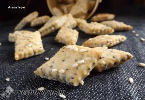 Hozzávalók: 15 dkg liszt 1 csapott tk só 2 tk szezámmag (és 1-1 csipet a tetejére) 3 tk egész mák 7,5 dkg vaj/margarin 6,5 dkg tejszín (30 %-os) Elkészítése: A lisztet egy tálba szitáljuk, majd beleszórjuk a sót és a magokat. Elkezdjük elmorzsolni benne a vajat/margarint és fokozatosan adagoljuk a tejszínt. Addig dolgozzuk, míg egy […]