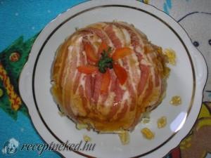 Hozzávalók: 60 dkg sertésszűz (hártyájától megtisztítva) 20 dkg bacon 1 csokor zsálya (8-10 levél) 1 kk só 1 kk bors 1 ek provence-i fűszerkeverék (sertésfűszerkeverék is lehet) 10 dkg fűszervaj (fokhagymás) 1 dl félszáraz fehérbor Elkészítése: Vegyünk elő egy 20 cm-es átmérőjű jénai kerek kúpos tálat, és kenjük ki vajjal, majd a baconnel béleljük ki […]
