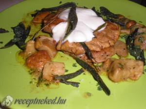Hozzávalók: 4 ek zsályalevél 2 ek olivaolaj 6 dkg vaj 10 dkg vargányagomba (lehet mirelit) só, bors 50 dkg sertés szűzpecsenye 8 dkg bivalymozzarella A zsályás sóhoz: 1 ek só 1/2 csokor zsályalevél Elkészítése: A zsályás sóhoz a sót és az apróra vágott zsályát mozsárban összetörjük, majd félretesszük. A zsályaleveleket forró olajban ropogósra pirítjuk, majd […]