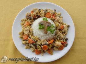 Hozzávalók: 80 dkg csirkemell filé 1 közepes fej vöröshagyma 1 doboz gomba (konzerv) 2 közepes sárgarépa 20 dkg zöldbab 5 tojás 5 ek napraforgó olaj 2 dl víz só ízlés szerint bors ízlés szerint 2 gerezd fokhagyma Elkészítése: A csirkemellet felkockázzuk, a sárgarépát felkarikázzuk. Olajon megdinszteljük a cikkekre szeletelt hagymát. Rátesszük a húst, sárgarépát, szeletelt […]