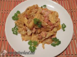 Hozzávalók: 10 dkg füstölt szalonna 1 közepes vöröshagyma 2 teáskanál fűszerpaprika 1 kg burgonya só ízlés szerint 30 dkg virsli 4 közepes db paprika 3 dl tejföl Elkészítése: A szalonnát felkockázzuk, zsírját kiolvasztjuk, majd rátesszük a megtisztított és felszeletelt hagymát, megszórjuk fűszerpaprikával. A burgonyát meghámozzuk, vékony hasábokra vágjuk, és rátesszük a paprikás hagymára. Ízlés szerint sózzuk, […]