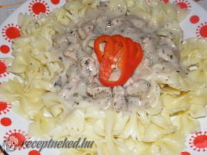 Hozzávalók: 2 csirkemellfilé 1 vöröshagyma 4 gerezd fokhagyma 3 ek olívaolaj 1 tk borsikafű 1 tk kakukkfű 1 tk bazsalikom 3 dl főzőtejszín 2 dl száraz fehérbor 1 ek keményítő ízlés szerint só Elkészítése: A húst kis kockákra vágom. Az olajon megdinsztelem az apróra vágott vöröshagymát és az áttört fokhagymát. Később hozzáadom a húst, felöntöm […]