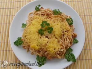 Hozzávalók: 50 dkg spagetti tészta 1 közepes vöröshagyma 5 ek napraforgó olaj 50 dkg darált sertéshús só ízlés szerint 2 gerezd fokhagyma 2 csomag bolognai alappor 5 dl főzőtejszín 20 dkg sajt 2 dl tejföl Elkészítése: A spagettit sós vízben kifőzzük, majd leszűrjük. A vöröshagymát megpucoljuk, felkockázzuk, és az olajon megdinszteljük. Rátesszük a darált húst, ízlés szerint […]