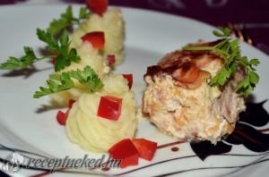 Hozzávalók: 8 szelet karaj 8 szelet gépsonka 150 g krémsajt 150 g trappista v. füstölt sajt 1 kaliforniai paprika 10 dkg bacon 2 dl főzőtejszín 2 nagy ek tejföl 1,5 dl húsleves alaplé só fehérbors pici olívaolaj Burgonyapüré: 1,5 kg burgonya tejföl, vagy tej ízlés szerint só kacsazsír Elkészítése: A hússzeleteket kiklopfoljuk, sózzuk, borsozzuk., majd […]