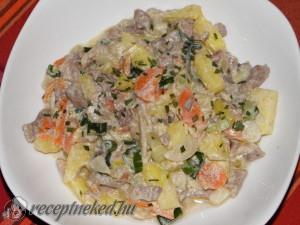 Hozzávalók: 60 dkg sertéstarja 3 ek napraforgó olaj 2 dl fehérbor (száraz) 1 vöröshagyma 2 lila hagyma 2 sárgarépa 1 fehérrépa 3 újhagyma (zöldjével együtt) 3 paprika 1 ananász 5 dl főzőtejszín 1 csokor metélőhagyma só ízlés szerint bors ízlés szerint Elkészítése: A sertéshúst vékony csíkokra vágom, a vörös- és lila hagymát félfőre, a répákat […]