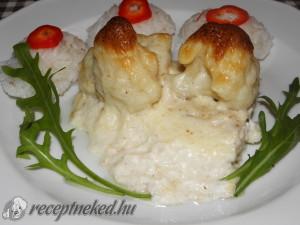 Hozzávalók: 50 dkg tőkehal filé 1 db karfiol 2 ek olíva olaj 5 dkg vaj 2 ek finomliszt 3 dl tej 1 dl főzőtejszín 10 dkg lágy kecskesajt frissen reszelt szerecsendió frissen őrölt bors só Elkészítése: A karfiolt rózsáira szedem, és enyhén sós forrásban lévő vízben, 5-10 perc alatt előfőzöm. A mártáshoz vajat olvasztok, elkeverem […]