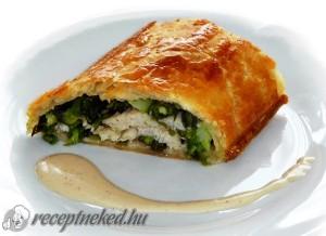 Hozzávalók: 1 cs leveles tészta 2 db tengeri halfilé (nem olcsó fagyasztott!!!!) 1 csomag spárga só halak-fűszerkeverék citrom színes bors 1 db tojás 1 ek olívaolaj Fehérbormártás hozzávalói: 2 dkg vaj 2 db vöröshagyma 3 dl fehérbor 3 dl húsleves alaplé 4 dl tejszín só őrölt bors Elkészítése: A spárgát enyhén sós vízben, pár perc […]