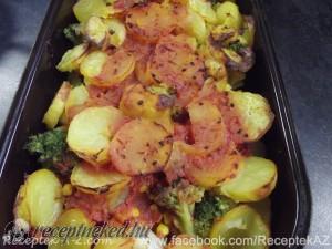 Hozzávalók: 1 kg krumpli (főtt) 25 dkg brokkoli (fagyasztott) 25 dkg karfiol (fagyasztott) 10 dkg kukorica (fagyasztott) 15 dkg zöldségkeverék (fagyasztott) 3 dl paradicsomszósz olaj ételízesítő őrölt fekete bors Elkészítése: A héjában főtt krumplit megpucoljuk, és karikákra vágjuk. Egy tepsit enyhén kiolajozzuk, az aljára teszünk egy sor krumplikarikát. Rátesszük a brokkoli és karfiol rózsákat, megszórjuk […]