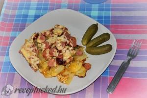 Hozzávalók: 1 kg krumpli 4 pár virsli (jó minőségű) 20 dkg füstölt kolbász 4 tojás 10 dkg sajt só szerecsendió majoránna kakukkfű étolaj Elkészítése: A krumplit, a füstölt kolbászt és a virslit vékonyan szeleteljük fel. A sajtot reszeljük le és a tojásokat üssük bele egy tányérba, majd villával alaposan verjük fel. Egy tepsibe öntsünk néhány […]