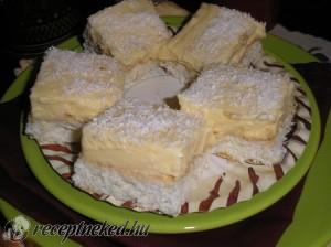 Hozzávalók: A tésztához: 6 darab tojásfehérje 25 dkg porcukor 10 dkg kókuszreszelék 10 dkg liszt 1/2 sütőpor A krémhez: 6 darab tojássárgája 1 vaníliás pudingpor 3 dl tej 10 dkg cukor Elkészítése: A vaníliapudingot a cukorral 3 dl tejjel megfőzzük, majd kihűtjük. A 20 dkg margarint habosra keverjük a vaníliás cukorral, és a pudinggal. Ezt […]